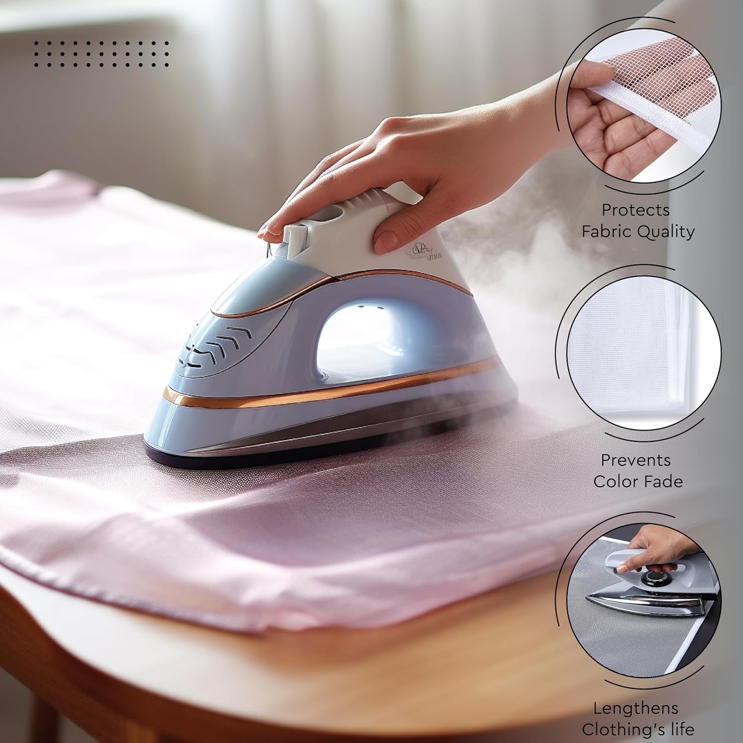 - ACCESSORIES INCLUDED: Each package includes one ironing board cover with pad, a white silicone iron rest for safely placing your hot iron, and a mesh cloth to protect delicate garments while ironing.