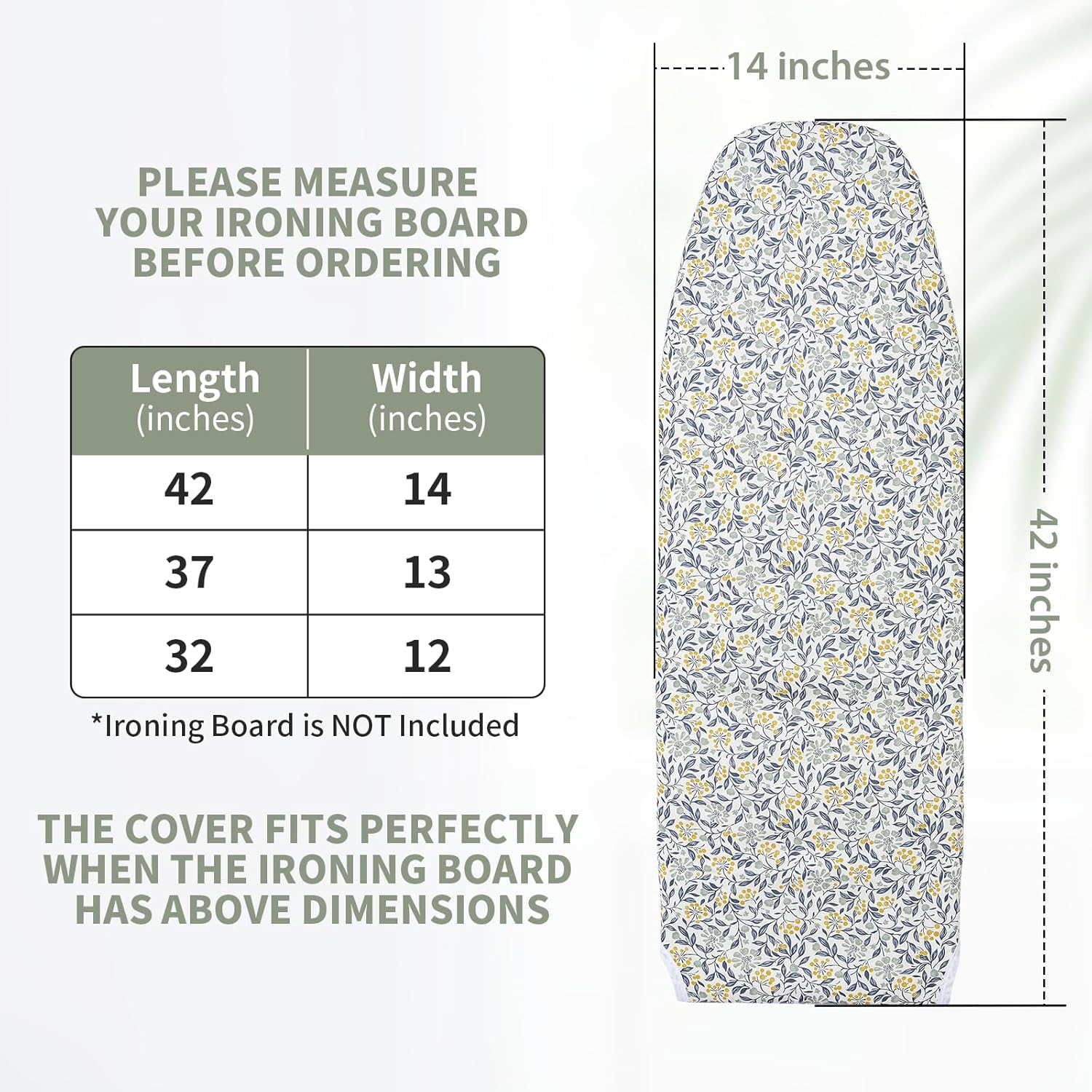 - SUITABLE FOR STANDARD IRONING BOARD: This ironing board cover designed for standard board to 42 x 14 inches. Suitable for standard size ironing boards with a width of 13 inches to 15 inches and a length of 40 inches to 42 inches. Note: Ironing board is NOT included